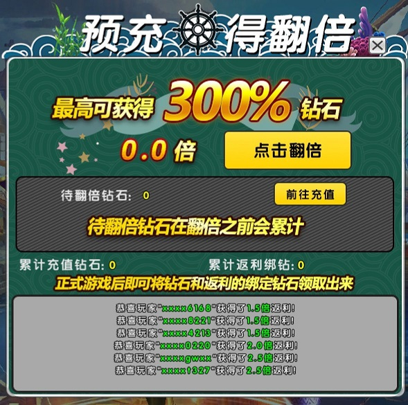活动形式:在创建角色页面参与预充值活动,可获得随机倍数的绑钻返还(最高返还300%);